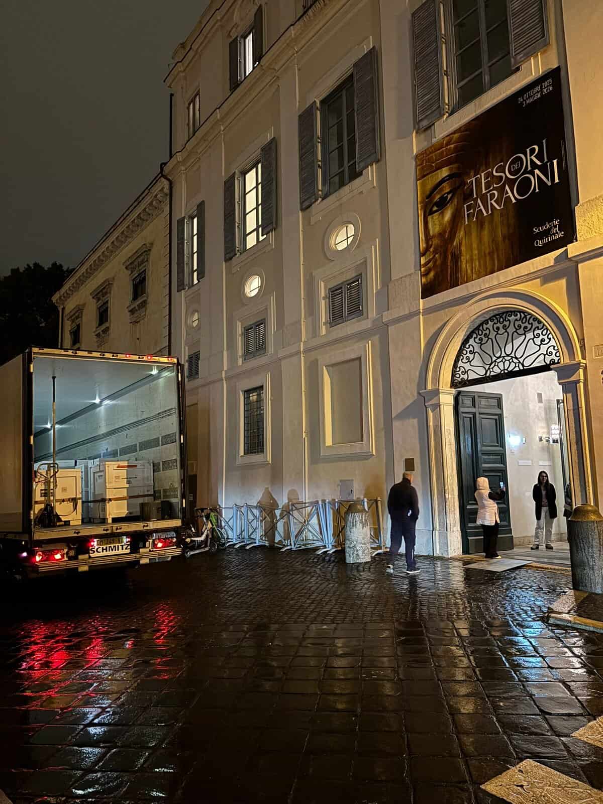 Le casse, scortate da restauratori e funzionari egiziani, sono state trasferite nei laboratori delle Scuderie per le delicate operazioni di disimballaggio e controllo conservativo, che proseguiranno nei prossimi giorni sotto stretto monitoraggio dei curatori e dei restauratori italiani ed egiziani.